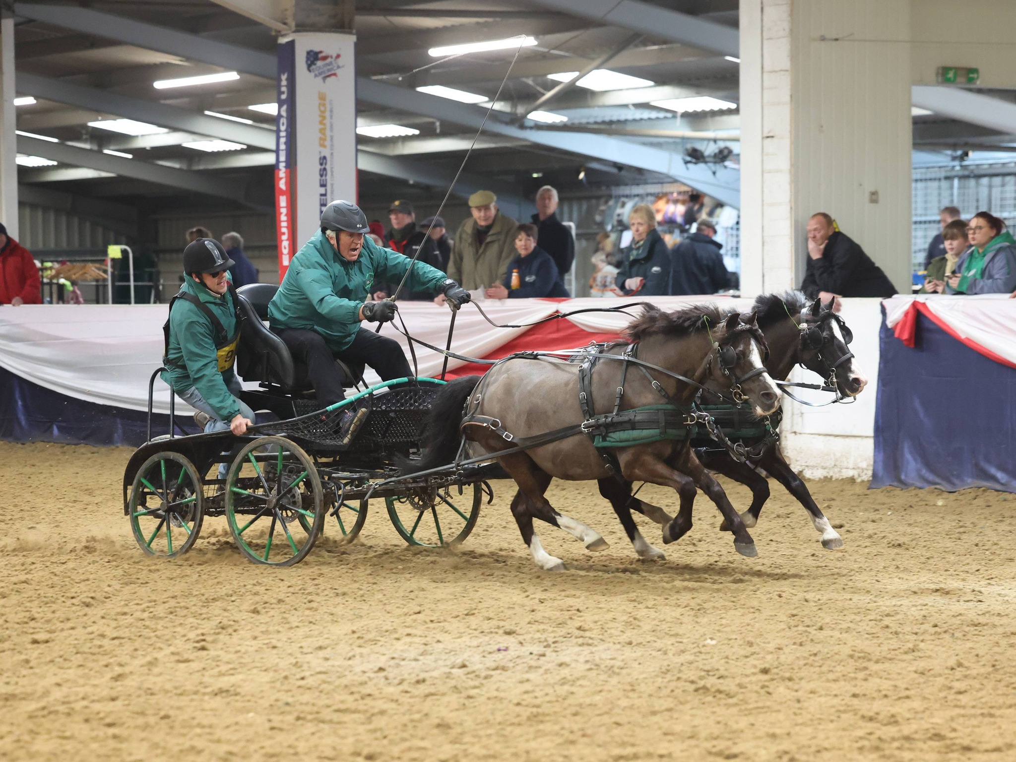 Small ponies are found everywhere indoor driving and from the 18 in the singles classes, titles went to Amy Harvey, novice, Catherine Tyler, intermediate, and Jessica Downham, open, with some exciting close finishes. Claire Bourne’s spotted small pair retained their title. The Supreme Small Pony Champion was Jessica Downham.